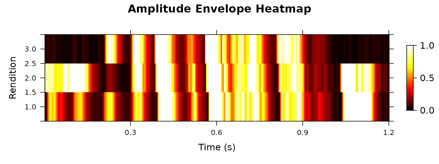 Once satisfied with detection quality, create a heatmap of amplitude envelopes across all detected motifs to visualize the temporal structure: